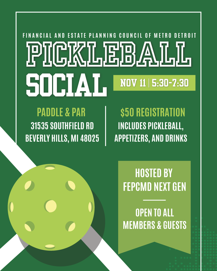 Join us for a fun, laid-back evening at Paddle & Par in Beverly Hills! While this event is hosted by our Next Gen group, it’s open to all members and guests of the Financial and Estate Planning Council of Metro Detroit. Athletic or casual wear encouraged! Locker rooms are available on-site if you’d like to change before or after the event.