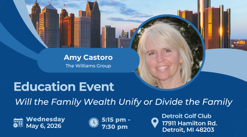 - 6:30 pm - Amy Castoro - "Will the Family Wealth Unify or Divide the Family?"